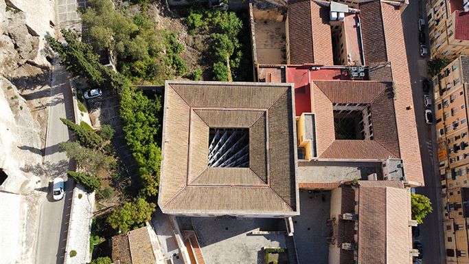translucent organza curtains float within renaissance arched courtyard in spain