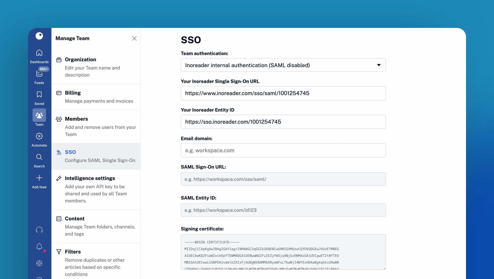 - Enabling SSO deactivates Inoreader authentication for all Team members except the Team admin, who retains the option to use it for emergency access.