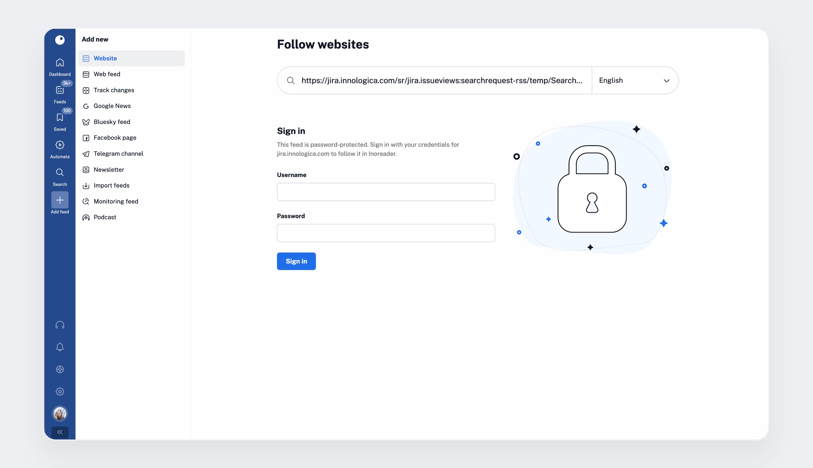 To add one, go to Add feed > Website, paste the feed URL, and press Enter. You’ll be prompted to enter your credentials. Once authenticated, the feed will be added to your account and will behave just like a regular feed.